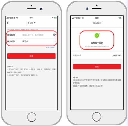 第三步:點(diǎn)擊添加賬戶—輸入本人名下他行銀行卡信息—進(jìn)行人臉識別通過后綁定成功。