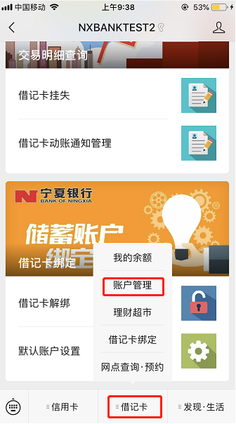 已持卡客戶,關(guān)注“寧夏銀行微銀行”公眾號,點擊底部菜單欄“借記卡”,選擇賬戶管理;