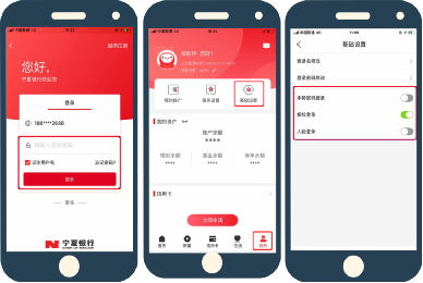第三步使用您剛才設置的用戶名及登錄密碼登錄手機銀行(也支持銀行賬戶或手機號碼與登錄密碼組合進行登錄);登錄成功后可進入“我的”,點擊“基礎設置”;設置自己喜歡的手勢/指紋/人臉等登陸方式。