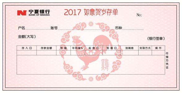 寧夏銀行如意賀歲存單,采用中國傳統(tǒng)剪紙工藝,將12生肖“酉雞”“祥云”“如意”“錢幣”等元素有機結合,體現(xiàn)中國非物質文化遺產(chǎn)工藝和活潑靈動的“酉雞”形象,使賀歲存單在滿足金融產(chǎn)品屬性的基礎上,通過藝術性、文化性、鑒賞性凸顯寧夏銀行如意賀歲主題的獨特個性。存單整體版面印制精美,不僅展現(xiàn)春節(jié)吉祥如意、大吉大利、幸福團圓的祝福,更展現(xiàn)出一份存單對中國文化的傳承和守護!
